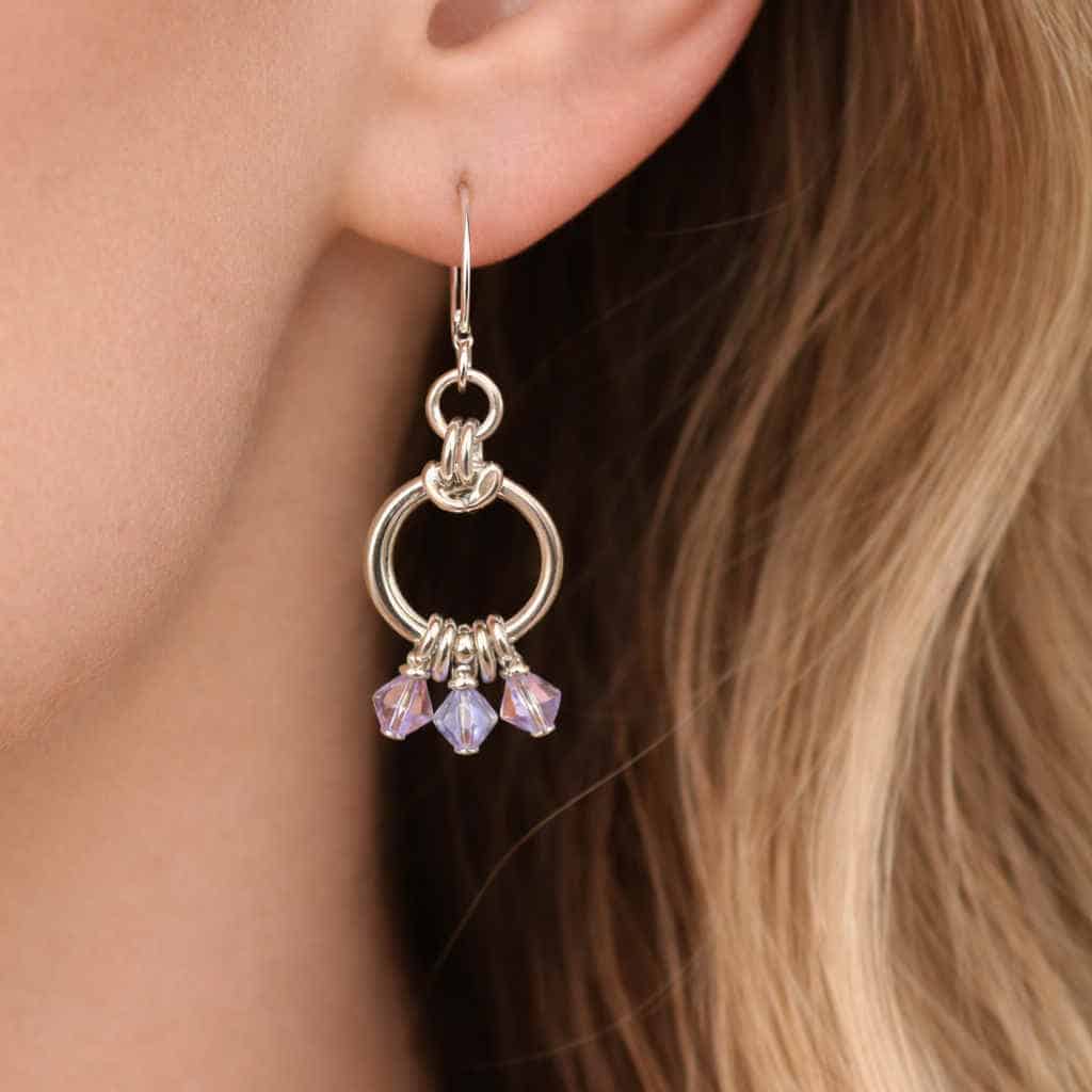 Delicate movement meets modern elegance in these handcrafted Argentium silver drop earrings. A polished circular design is adorned with shimmering Swarovski Tanzanite crystals, catching the light with soft hues of violet and blue with every turn.