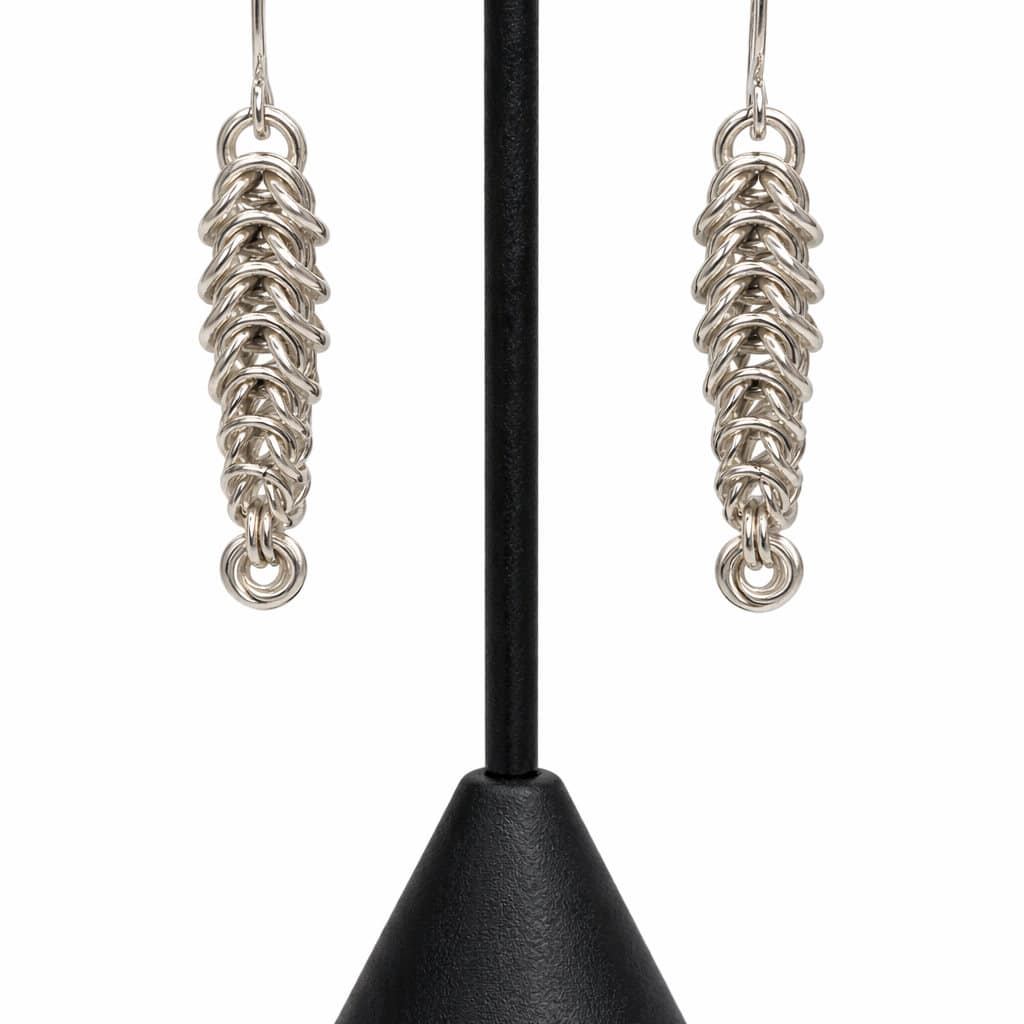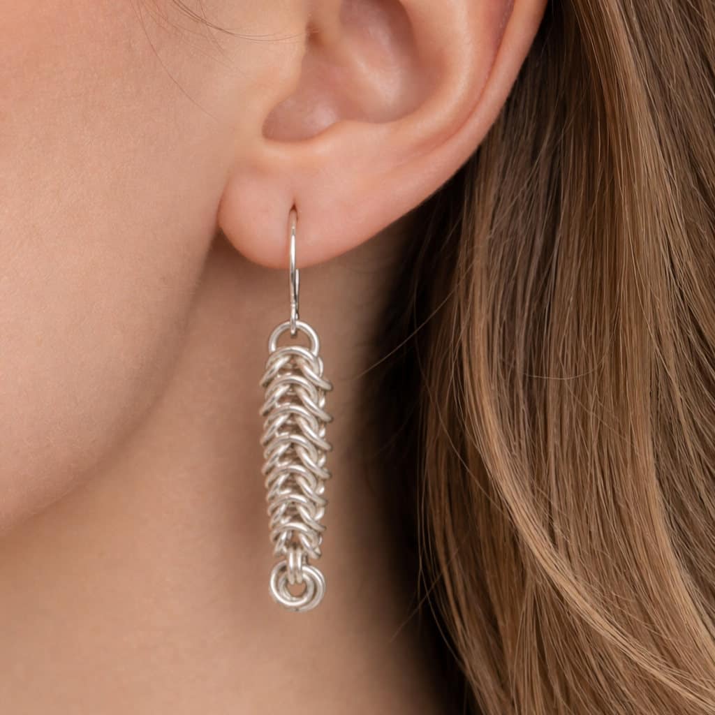 These earrings are handwoven in the box chain maille weave, a classic pattern that forms a square, dimensional column of interlocking rings. The structure gives the chain a clean, geometric look while still allowing it to move fluidly. As the earrings sway, the woven rings catch the light and highlight the depth and texture of the pattern. The bottom of ear earring is finished off with a miniature vortex, also made of silver.