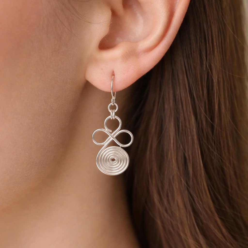 Graceful and eye-catching, these silver drop earrings showcase a beautifully handcrafted wire design that blends fluid movement with modern simplicity. A delicate infinity loop rests above a mesmerizing spiral disc, creating a harmonious balance of form and flow.