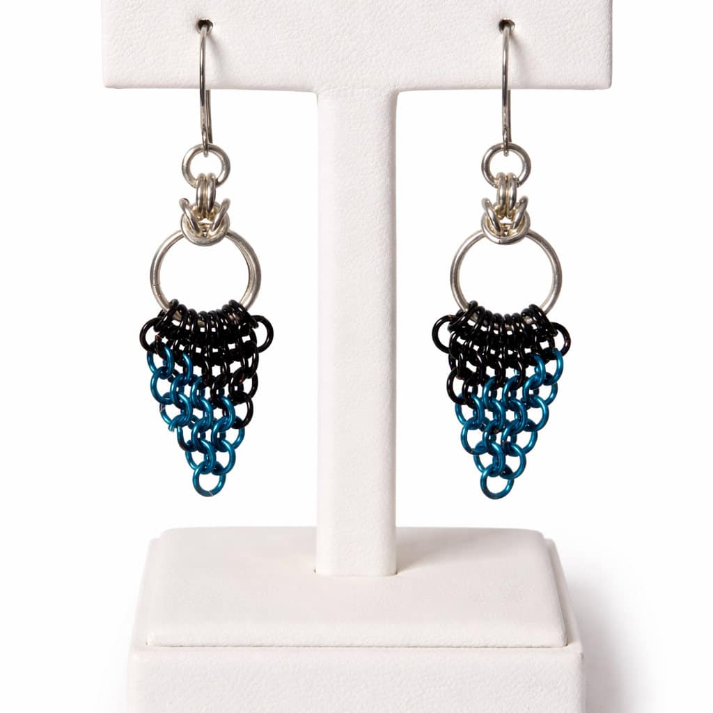 Each earring features my signature colorful enameled copper jump rings, carefully arranged in a flowing waterfall design. They’re finished with my handmade Argentium® silver ear wires for a bright, tarnish-resistant touch that elevates the entire look. From the bottom of the ear wire, these earrings are 1 ¼” in length and just over ½” at their widest point, each weight just 3.3 grams.